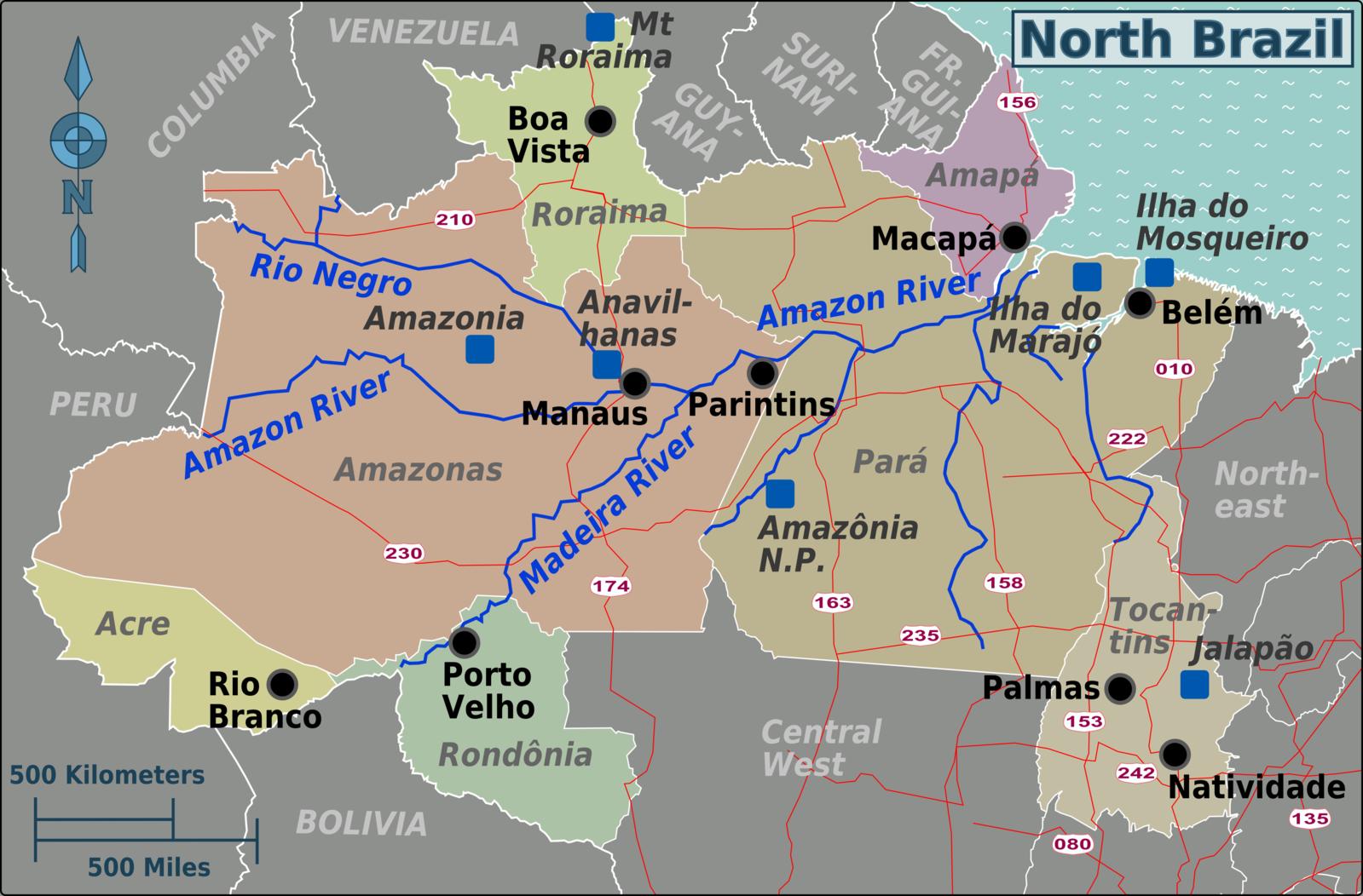 Carte du nord du Brésil. Le nord de la carte du Brésil (Amérique du Sud - Amérique) à imprimer. Le nord de la carte du Brésil (Amérique du Sud - Amérique) à télécharger. La région Nord du Brésil est la plus grande région du Brésil, correspondant à 45,27% du territoire national comme le montre la carte du Nord du Brésil. C'est la région la moins habitée du pays, et elle ne contribue que pour un faible pourcentage au PIB national et à la population. Elle est composée des États d'Acre, Amapá, Amazonas, Pará, Rondônia, Roraima et Tocantins.